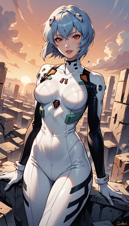 EXAMPLE: score_9, score_8_up, score_7_up, Western Comics, Portrait, Asuka Langley Soryu, cute, seductive, innocent, light smile:0.3, plump lips, slender body, long hair, floating hair, red plugsuit, sunset, lake background, depth of field, dynamic angle, fashion photography, sharp, hyperdetailed:1.15