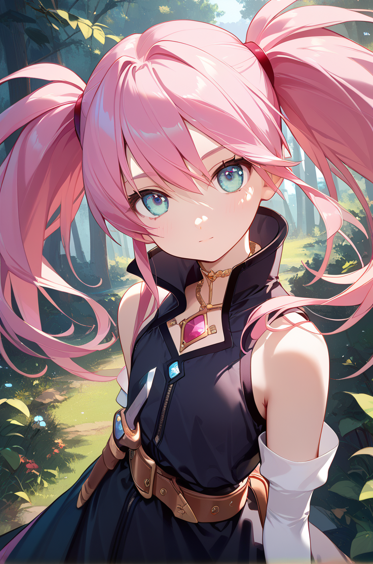 preseaBase, pink hair, twintails, long hair, sidelocks, chest jewel,