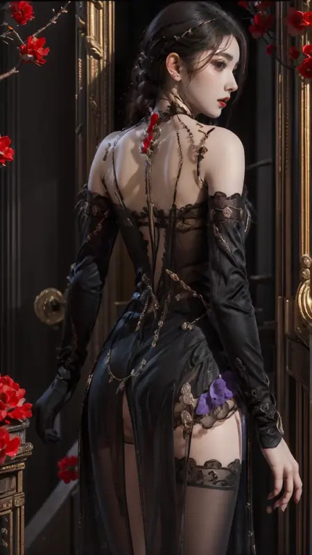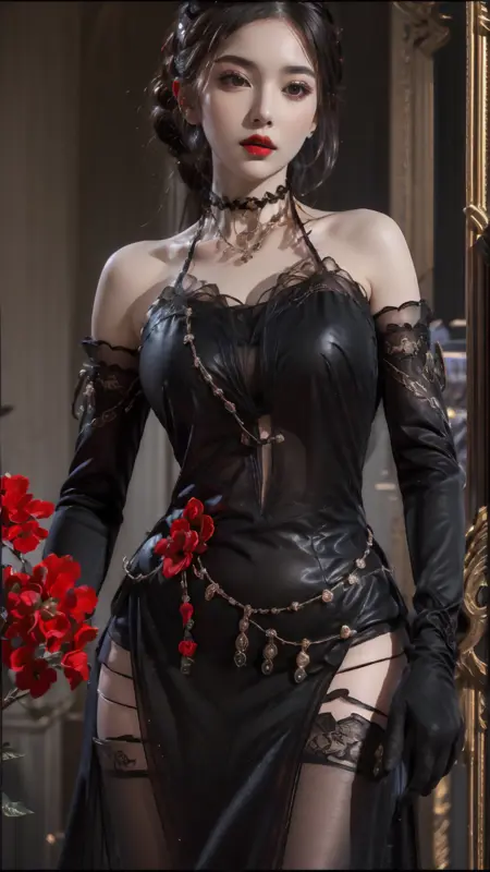 真夜中のキス衣装、レース、黒いストッキング、手袋、赤い花、ジュエリー、紐、チェーン、紫のシャツの一部