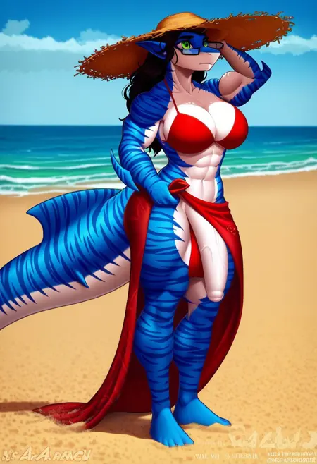 sharkadriannapxl, shark, futanari, dark hair, green eyes, big breasts, puffy nipples, multicolor skin, blue body, white stomach,