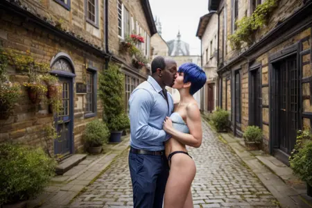 lora:kssmxFT15:0.7,{1girl, }{1boy, }{hetero, }{dark-skinned male, }{realistic, }{closed eyes, }{kiss, }{interracial, }{jewelry, }{facial hair, |}{couple, |}{ksslky, |}{kissstd, |}{kissing, |}{nude, |}{very dark skin, |}{shirt, ||}{upper body, ||}{penis, ||}{beard, ||}{imminent kiss, ||}{navel, ||}{french kiss, ||}{tongue, ||}{pants, ||}{pubic hair, ||}{completely nude, ||}{from side, ||}{standing, ||}{male pubic hair, ||}{ass, ||}{piercing, ||}{erection, ||}{muscular, ||}{open mouth, ||}{looking at another, ||}