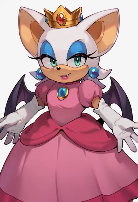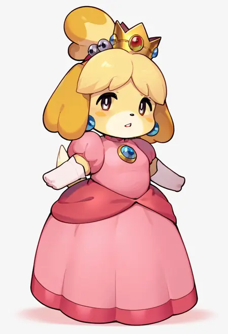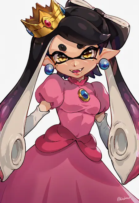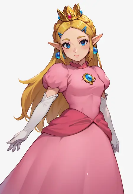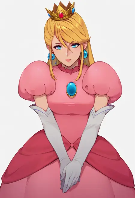 1girl, <character>, p34ch3s-dress, cosplay, crown, blue earrings, jewelry, pink dress, elbow gloves, white gloves