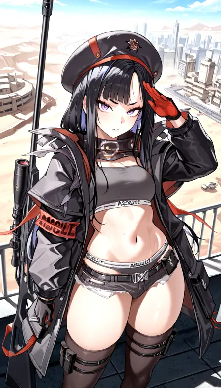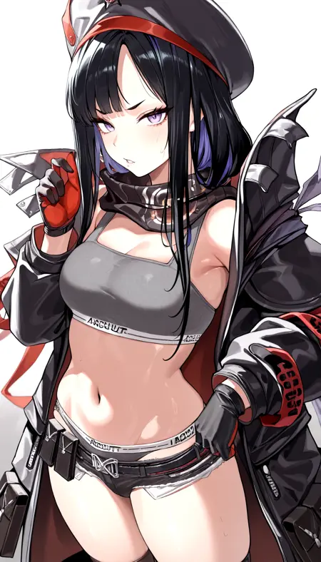 オーバースペックプロンプト(Illust V2専用): eunhwa_nikke, overspec, absolutebra, absolutepan, グローブ, ショートパンツ, ジャケット, ベレー帽