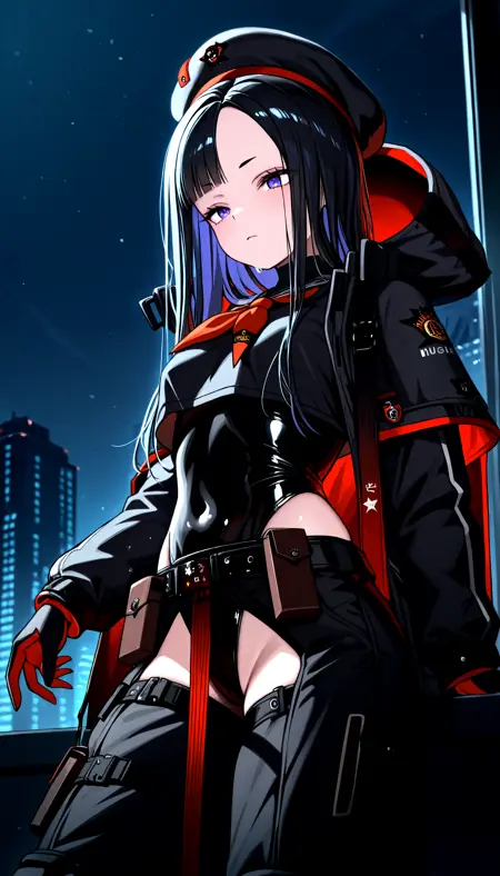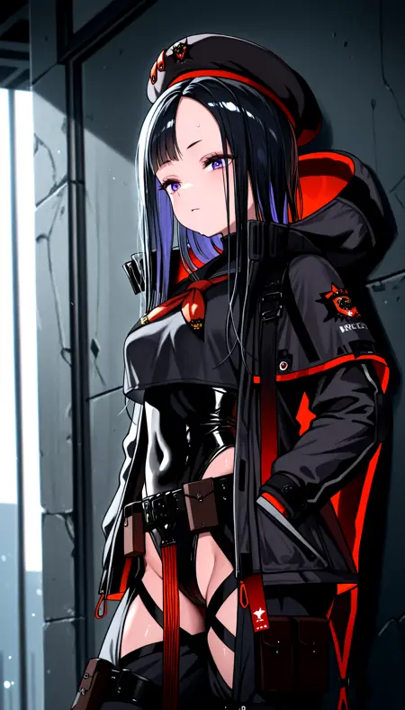 標準装備プロンプト: eunhwa_nikke, std_outfit, govtag, ベレー帽, ベルト, チャップス, リュック, フード