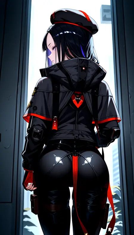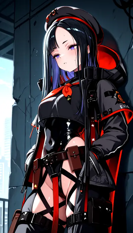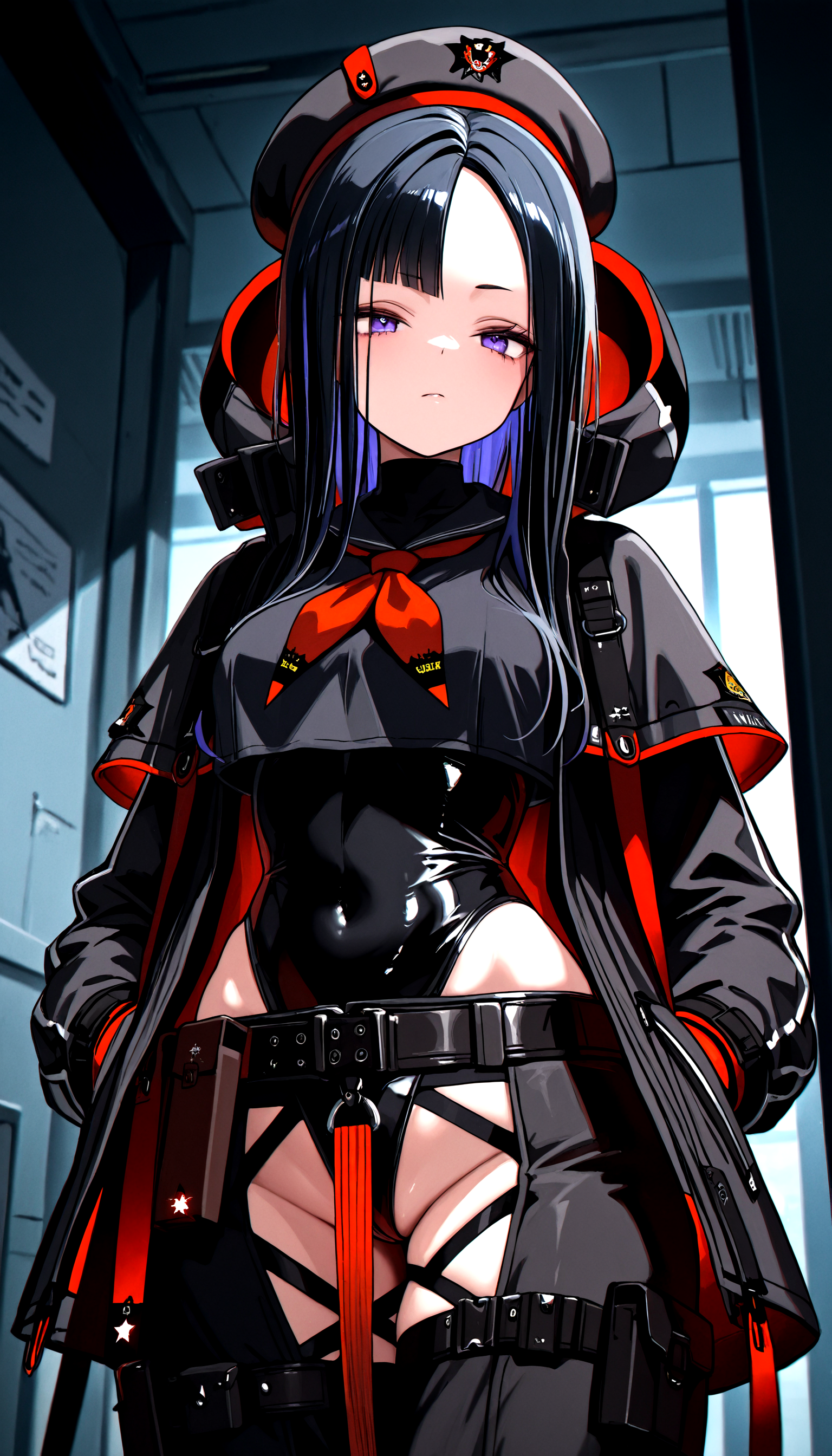 标准服装提示词:eunhwa_nikke, std_outfit, govtag, beret, belt, chaps, leotard, hood