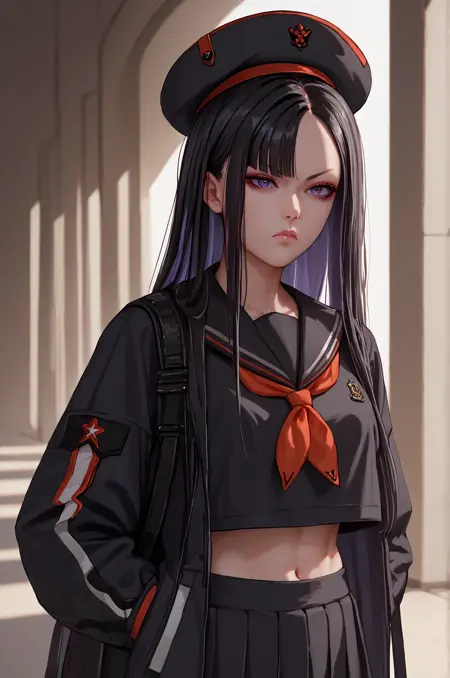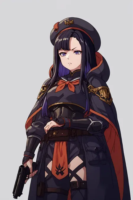 标准服装提示词:eunhwa_nikke, std_outfit, govtag, beret, belt, chaps, leotard, hood