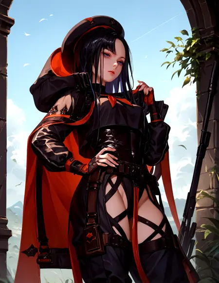 標準装備プロンプト: eunhwa_nikke, std_outfit, govtag, ベレー帽, ベルト, チャップス, リュック, フード
