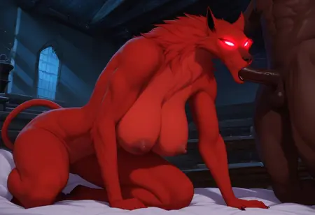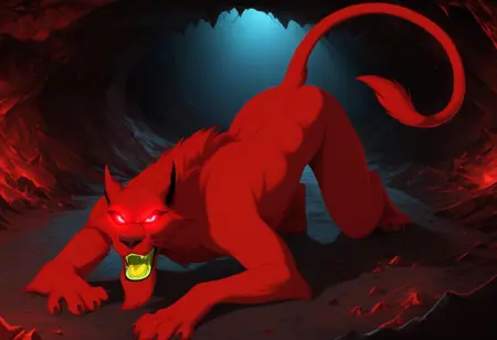 猫、悪魔、フューリー、アンスロ、赤い体、赤い毛、青いローブ、緑の歯、黄色い舌、ひげ、爪