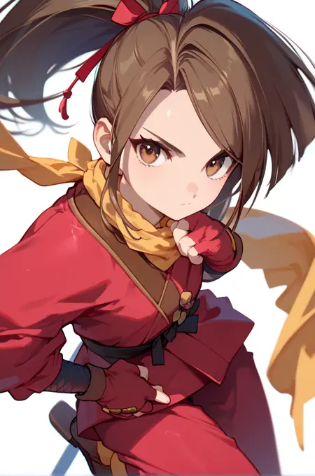 밝은 빨간 옷, 닌자, 노란 스카프, 손가락 없음 장갑,