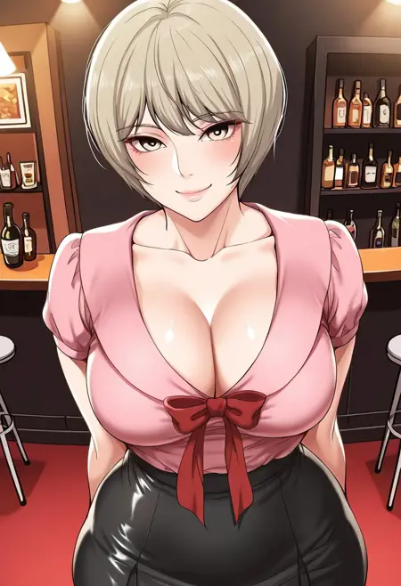 ((세ksi 긴 소매 분홍 셔츠, 엽기적인 가슴선, 거대한 가슴선, 세ksi 검은 연필 치마, )) 갈색 가방, 아름다운 미학적 심장형 빨간 보석 펜던트가 달린 금 목걸이, 세ksi 빨간 레이스 브라, 세ksi 빨간 레이스 속옷,