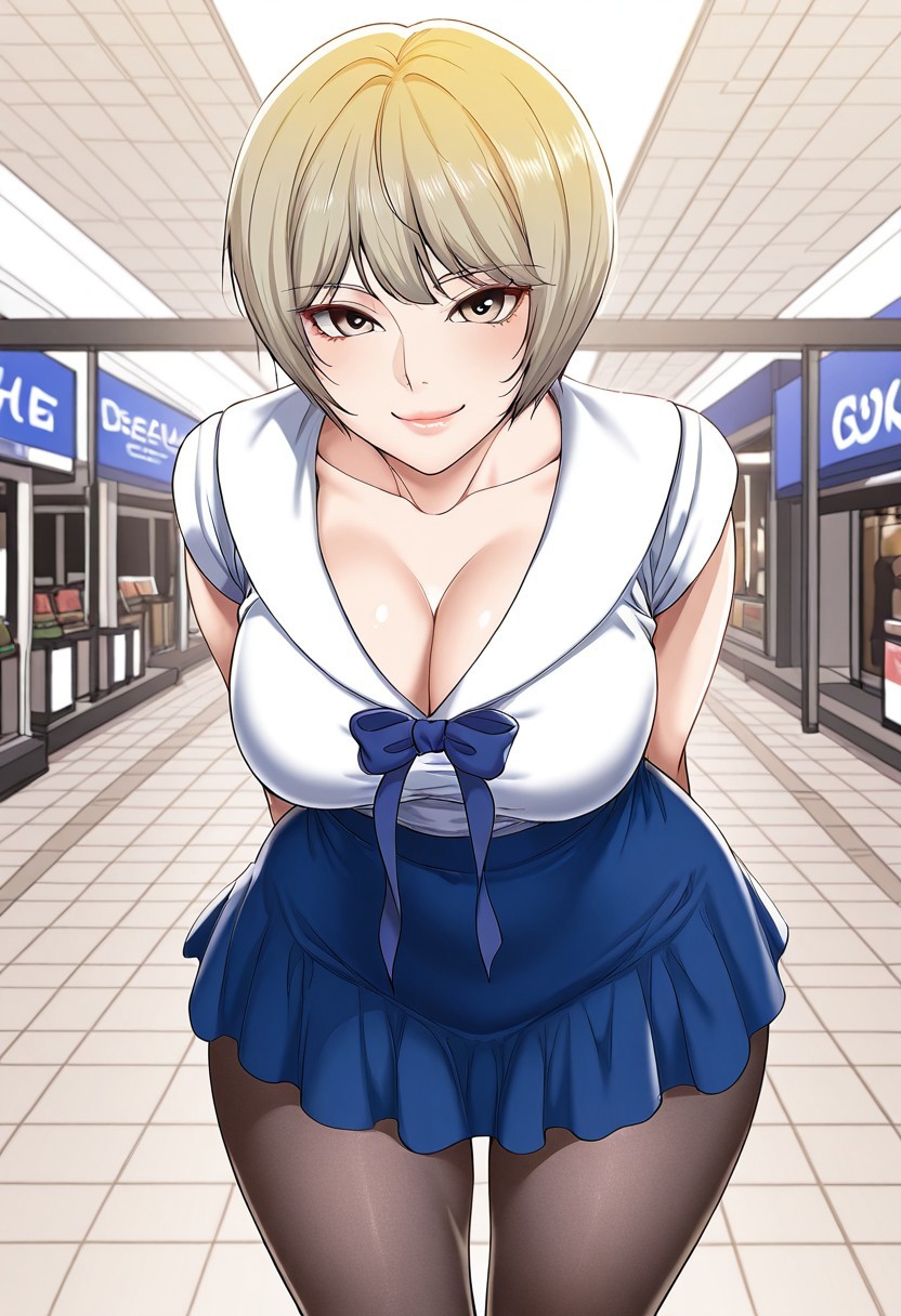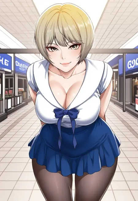 ((아름다운 미학적 짧은 소매 흰 상의, 큰 파란 리본, 엽기적인 가슴선, 거대한 가슴선, 아름다운 미학적 긴 주름진 푸른 치마, 세ksi 투명한 컷아웃 검은 스타킹, )) 세ksi 검은 브라, 세ksi 에로틱한 검은 속옷, 검은 하이힐, 갈색 가방,