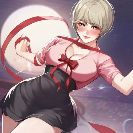 1. ((beautiful aesthetic long-sleeeves pink top with red bow, obscene cleavage, huge cleavage, beautiful aesthetic black skirt, )) black high-heels, sexy white panties,