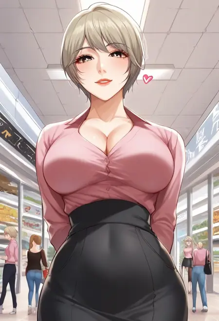 4. ((sexy long-sleeves pink shirt, obscene cleavage, huge cleavage, sexy black pencil skirt, )) brown bag, gold necklace with beautiful aesthetic heart-shaped red gem pendant, sexy red lace bra, sexy red lace panties,