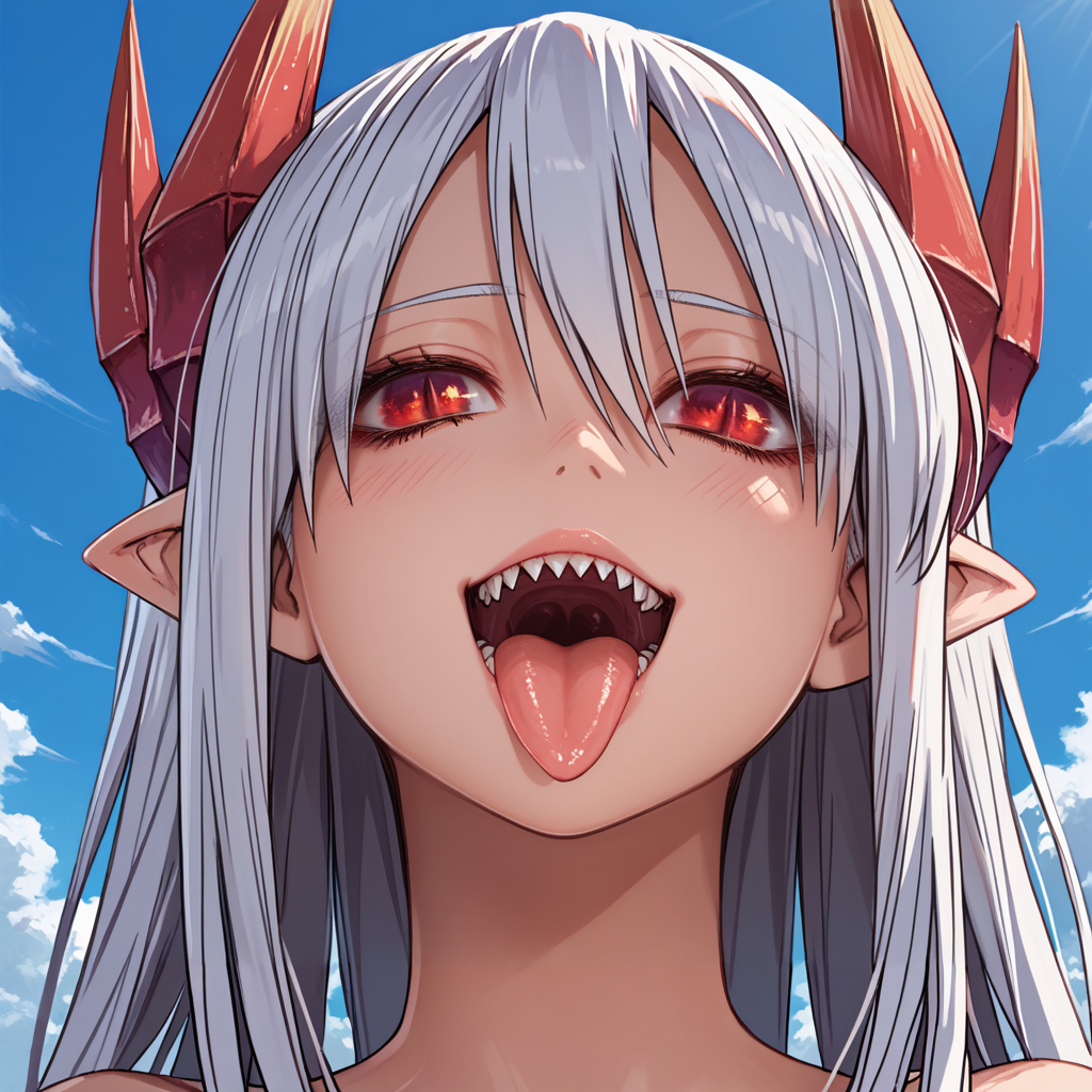lorem \(mazohaha\),demon horns,white hair,long hair,red eyes,slit pupils,pointy ears,low wings,feathered wings,white wings,white tail,