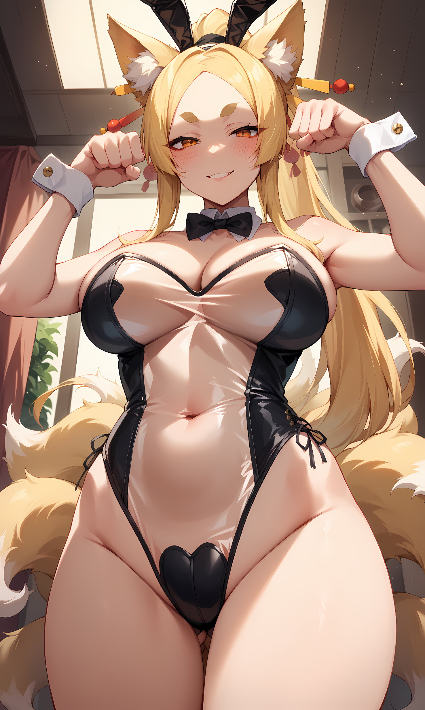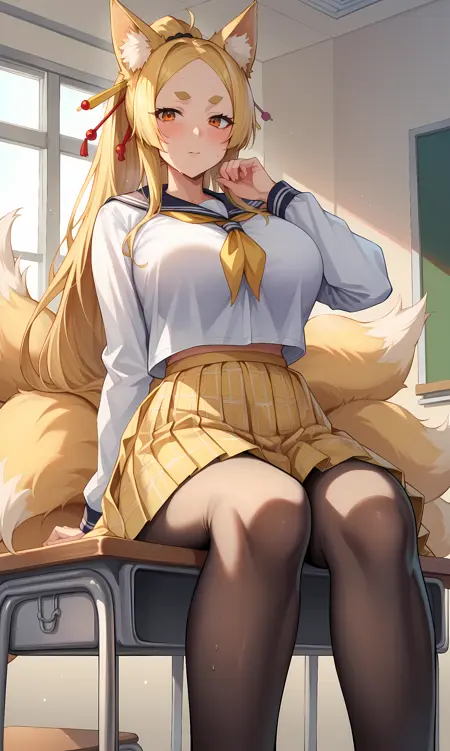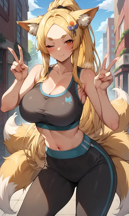 外見: やさか、オレンジ色の目、濃い眉、金髪、非常に長い髪、分け目のある前髪、ポニーテール、キツネの耳、キツネの尾、複数の尾、髪飾り、髪止め