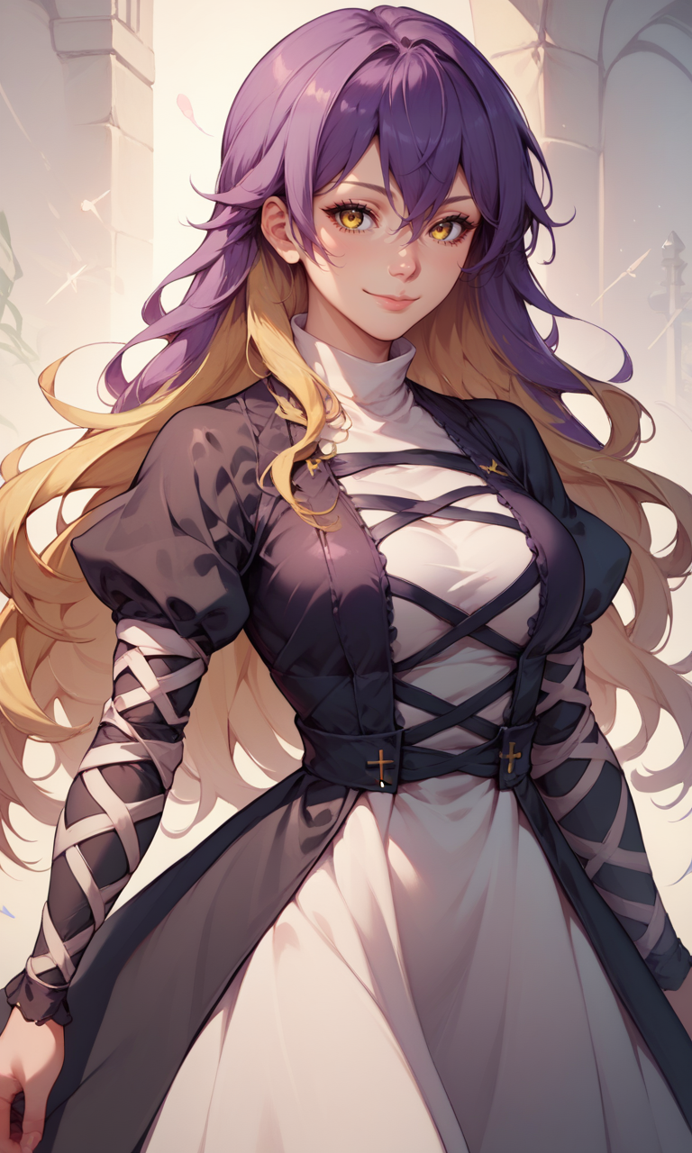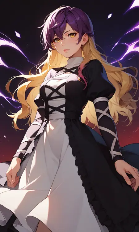 彼女の髪には gradient_hair または two-tone_hair(両方でも可)を使用できます。あなたのスタイルのLoRAやチェックポイントにどの設定がより適しているか、実験することをお勧めします。