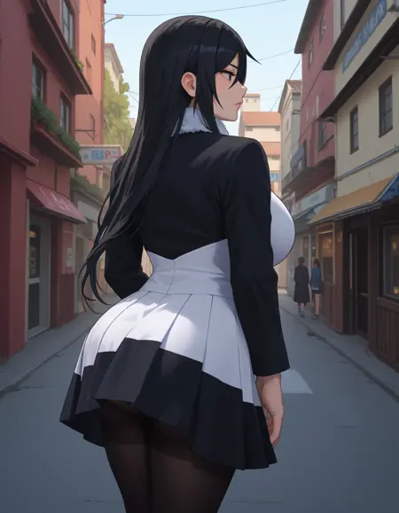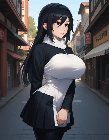 "kamyuk, 검은 머리, 흑백 드레스, 긴 소매, 검은 눈, 모피 컬러, 주름 드레스, 검은 팬티스타킹, 긴 머리"