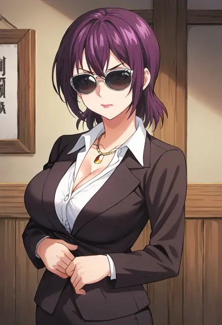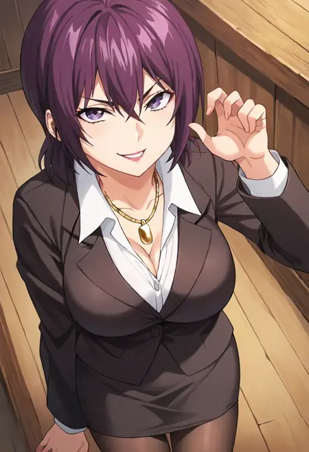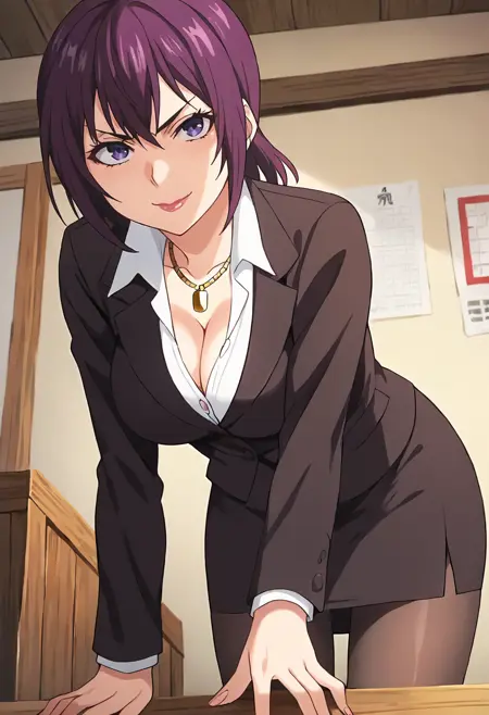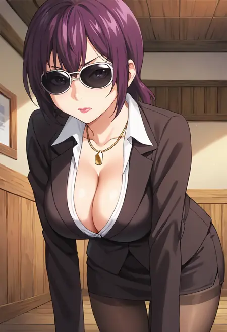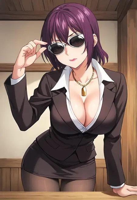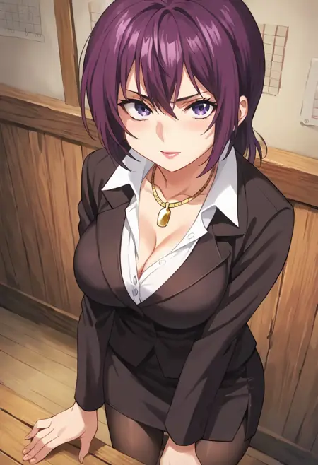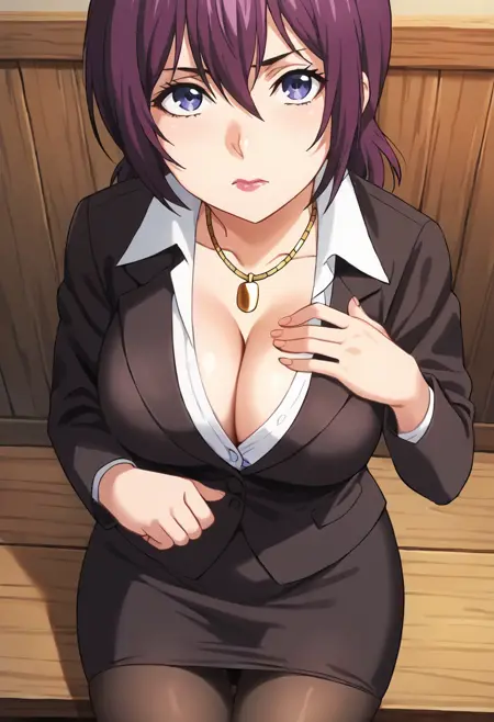score_9, score_8_up, score_7_up, masterpiece, source_anime, 1girl, ct_yaeko, medium hair, purple hair, large breasts, light purple eyes, gold necklace, black suit, bre peek, long sleeves, black pencil skirt, pantyhose, looking at viewer, indoors, wooden wall, cowboy shot,