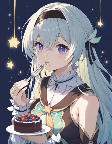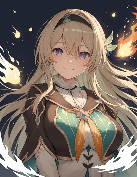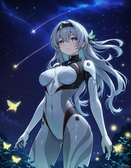 角色身份:使用提示词如 1girl, solo, long hair, breasts, looking at viewer, bangs, hair between eyes, hair ornament, hairband 抓住萤火虫的本质。这些元素确保其标志性外貌——从独特的发型到富有表现力的面部特征——得到精准还原。