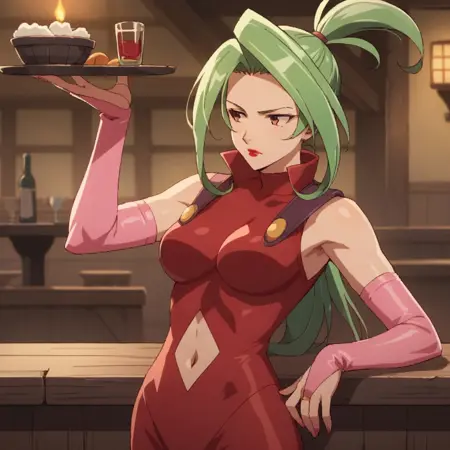 ursula_dk, green hair, long hair, arching ponytail, elbow gloves, lipstick, navel cutout,