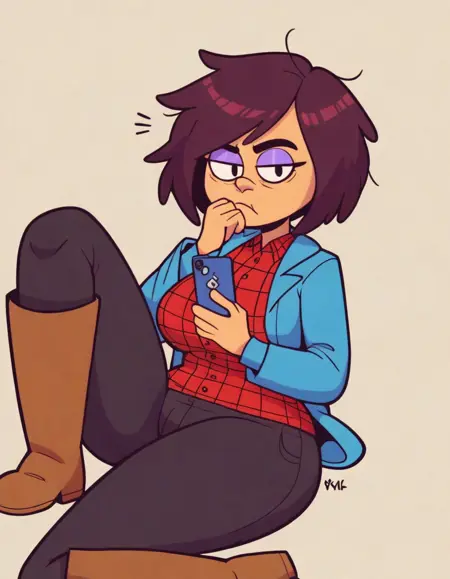 플럼프, 검은 머리, 짧은 머리, 검은 눈, 보라색 아이섀도우, 파란 자켓, 빨간 셔츠, 체크무늬 셔츠, 검은 바지, 갈색 부츠, 무릎 부츠