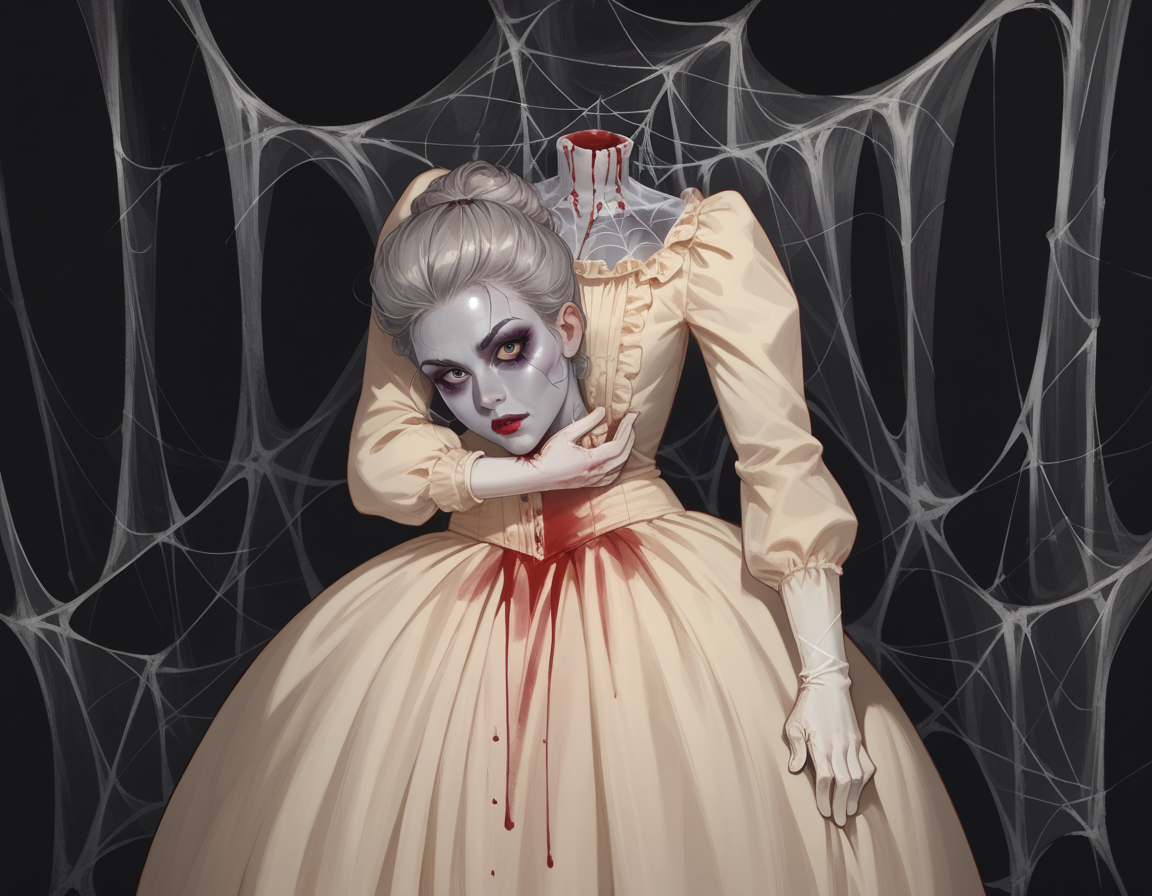 Other: white gloves, 1boy, male focus, food, spider web, robe, 1girl, dress, long sleeves, bl00d (but spelled properly), horror (theme), s3v3red head (also spelled correctly), makeup, lipstick, eyeshadow, white gloves, elbow gloves