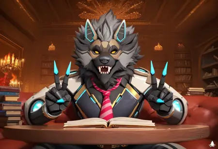 1boy、オオカミ、フーリー、アンスロ、機械的な体、黄色い目、瞳孔なし、犬歯、鋭い歯、赤いネクタイ、灰色の髪、単眼鏡、青い爪