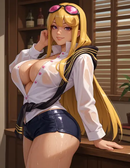 "kurky,金色长发,头戴眼镜,太阳镜,白衬衫,衬衫未扣,露出胸脯,超短裤,黑色短裤,黑色围巾,紫色眼睛,衣物缠绕腰部"