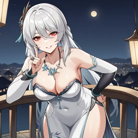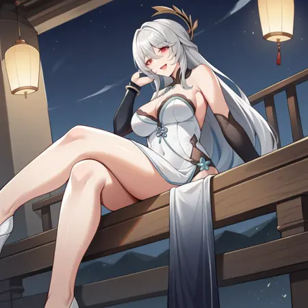 HadesAG, Hds_CN, 红眼,灰发,长发,暗黑风白色长裙,中式服装,无肩带连衣裙,银色项链,胸线,渐变骨盆帘幕,渐变连衣裙,裙身印花,淡蓝色花朵,肘部手套,渐变手套,黑色手套,新娘臂套,银色手镯,发簪,银色发饰,服装开衩,肩部纹身,腿部花朵纹身,腿部纹身,