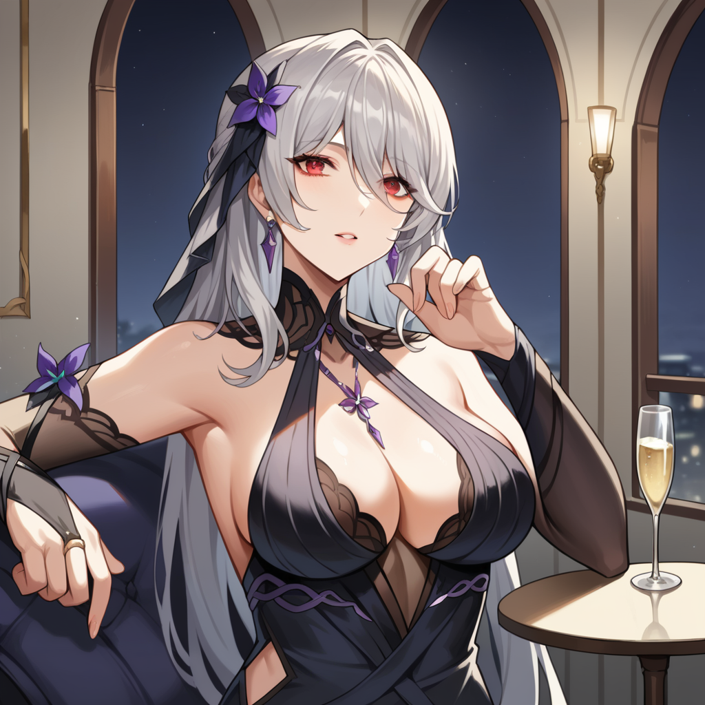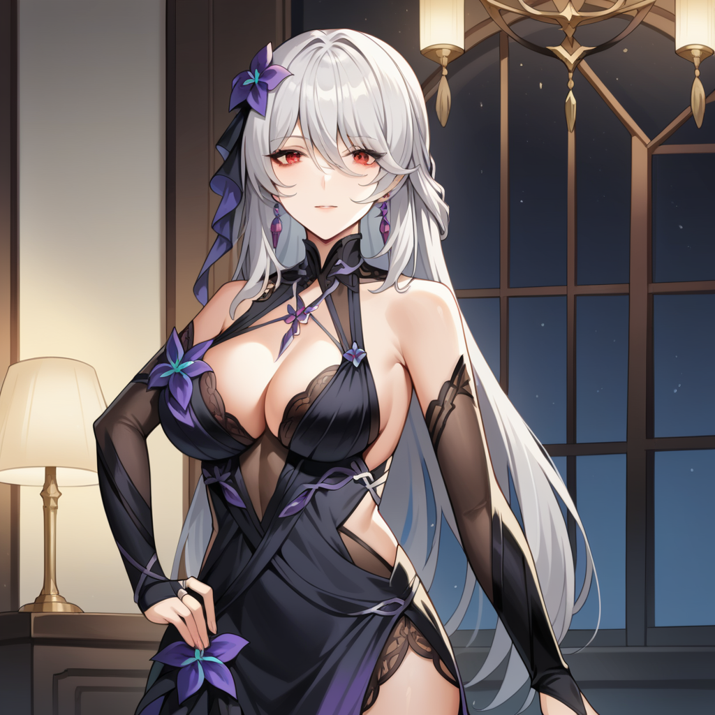 HadesAG, Hds_Drs, 红眼,灰发,长发,黑色暗黑风连衣裙,挂脖礼服,晚礼服,胸线开衩,吊坠,紫色耳环,发饰,发带,无袖连体衣,裸露腿部,黑色手套,新娘臂套,紫色花朵,独立袖子,蕾丝袖子,黑色袖子,裸露肩膀,开衩裙摆,中长裙摆,双面裙摆,紫色裙摆,大腿开衩,面纱,