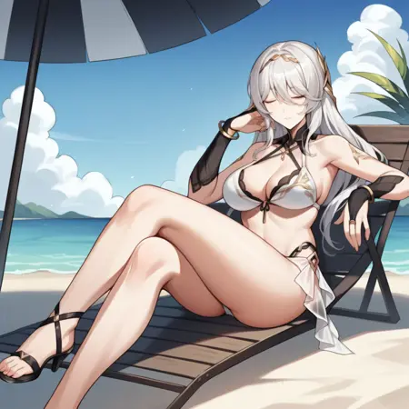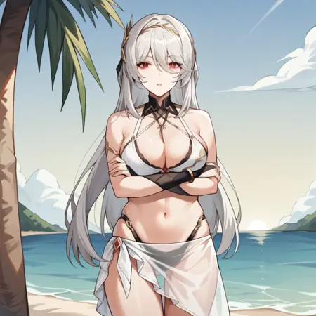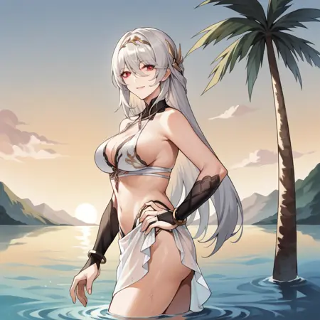 HadesAG, Hds_Swm, 红眼,灰发,长发,白色比基尼,白色比基尼上衣,黑色比基尼下装,泳装,交叉挂脖式,黑色颈圈,项链,前系带比基尼上衣,白色纱笼,透明纱笼,珠饰,黑色新娘臂套,金色手镯,臂环,多带式比基尼下装,黑色丝带,大腿环,金色玫瑰,叶形发饰,发夹,月桂冠,