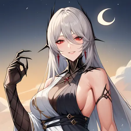 HadesAG, Hds_Def, 红眼,灰发,长发,白色连衣裙,透明胸线,不对称服装,挂脖式,交叉系带,多条腰带,黑色腰带,胸下束腰,珠宝,耳环,头饰,爪形戒指,黑色连裤袜,无袖连衣裙,双色连衣裙,黑色连衣裙,长裙,荷叶边裙摆,长裙摆,侧开衩,大腿绑带,单侧独立袖子,单侧宽袖,白色袖子,手套,黑色手套,尖刺,装甲领圈,