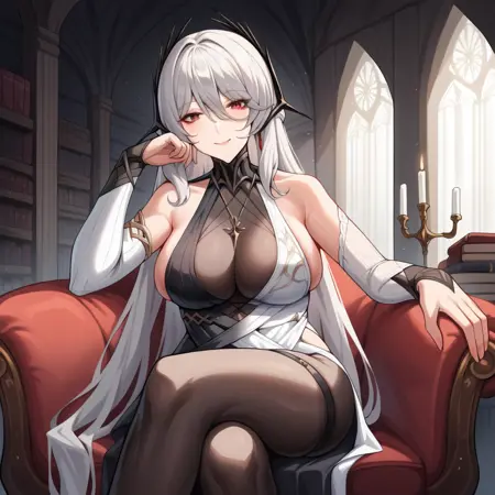HadesAG, Hds_Def,  red eyes, grey hair, long hair, white dress, see-through cleavage, asymmetrical clothes, halterneck, criss-cross strings, multiple belts, black belt, underbust, jewelry, earrings, headgear, claw ring, black pantyhose, sleeveless dress, two-tone dress, black dress, long dress, frilled skirt, long skirt, side slit, thigh strap, single detached sleeve, single wide sleeve, white sleeves, gloves, black gloves, spikes, armored collar,