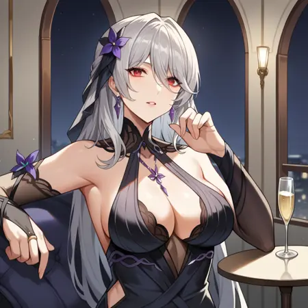 HadesAG, Hds_Drs, red eyes, grey hair, long hair, alt black dress, halter dress, evening gown, cleavage cutout, pendant, purple earrings, hair ornament, hairband, sleeveless bodystocking, bare legs, black gloves, bridal gauntlets, purple flower, detached sleeves, lace sleeves, black sleeves, bare shoulders, open skirt, medium skirt, two-sided skirt, purple skirt, thigh cutout, veil,
