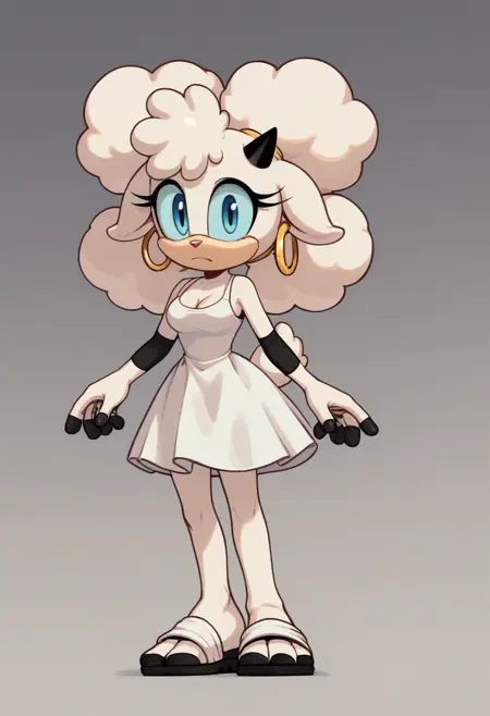 Appearance: afro puffs, white skin, curled tail, teal sclera, pink nose