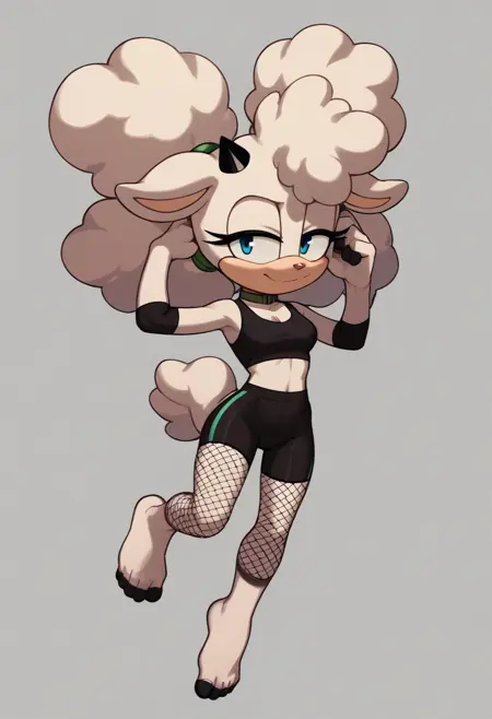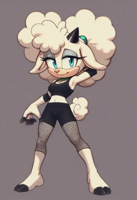 Appearance (use either Single horn or Black horns depending on the angle): lanolin the sheep, afro puffs, ((white fur)), hair tie, black elbow pads, sheep tail, red nose, black fingers, single horn, teal sclera, blue eyes