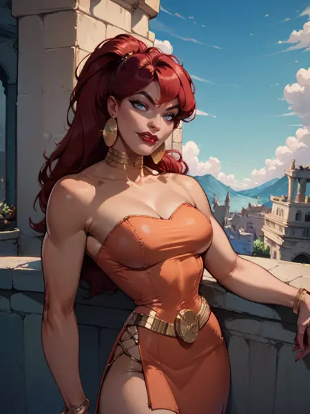 提示:吉甘塔,1个女孩,珠宝,圆环耳环,粉色连衣裙,红发,手镯,口红,长发,乳房,蓝眼睛,乳沟