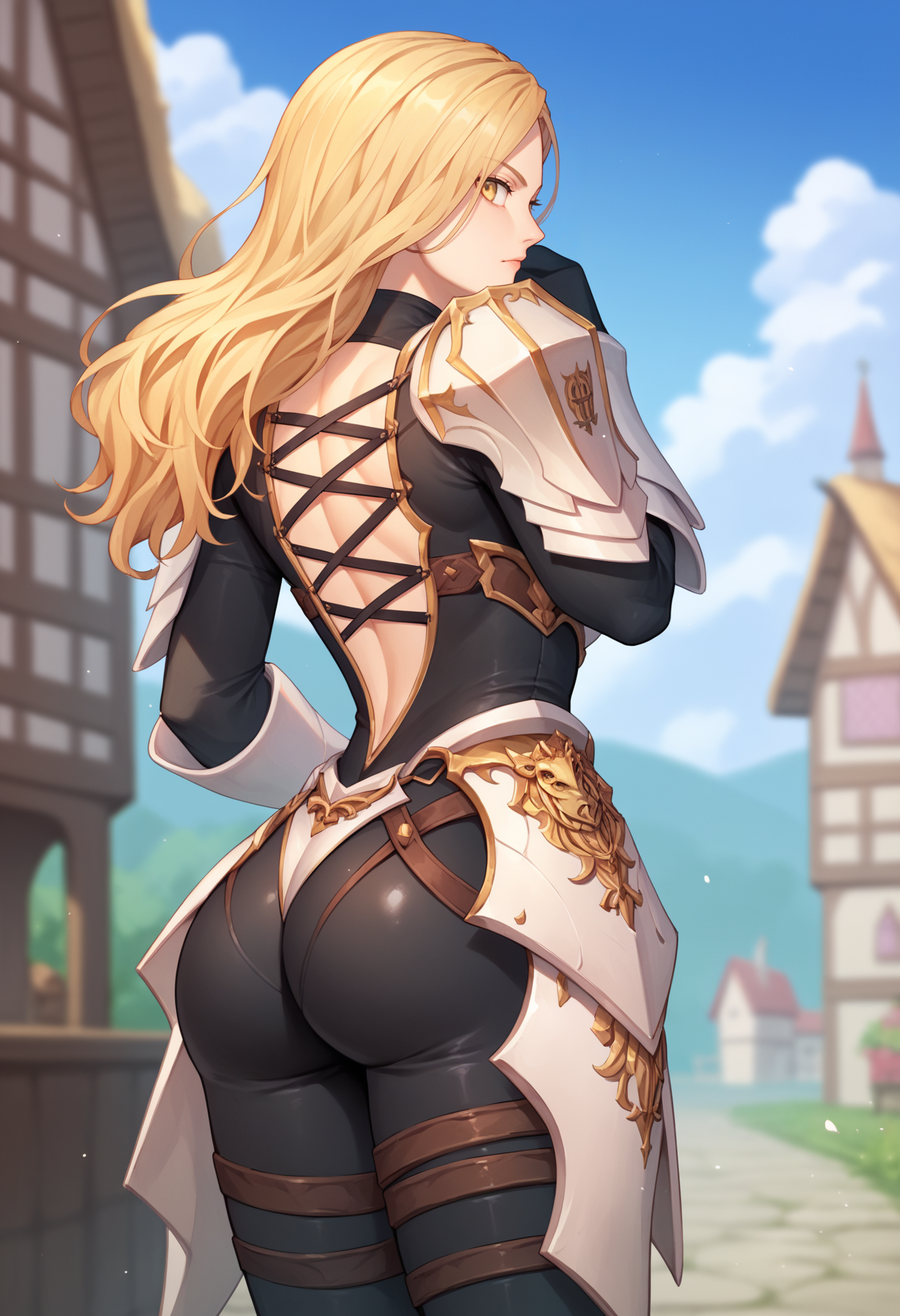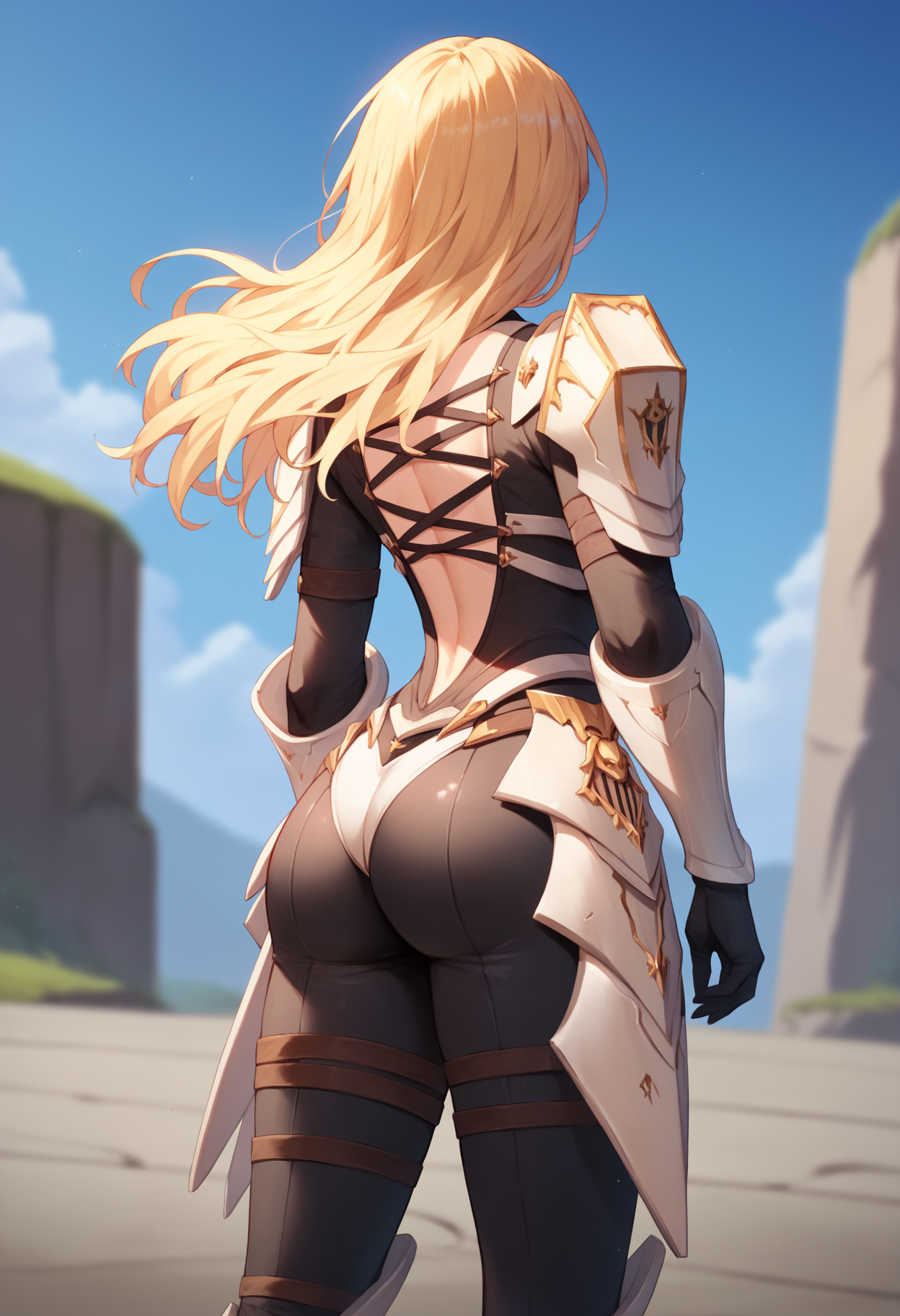 뒷면 프롬프트: armor, ass, back, back cutout, bodysuit, pauldrons, shoulder armor, skin tight, from behind, median furrow