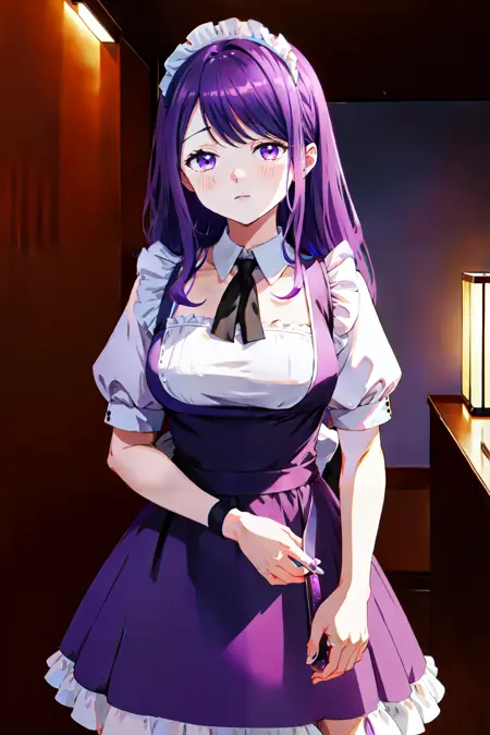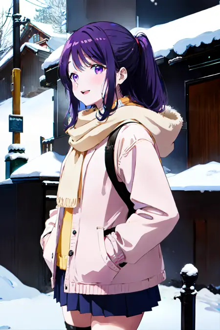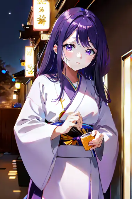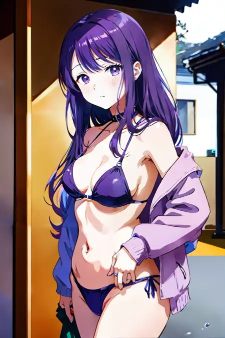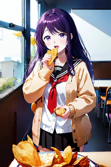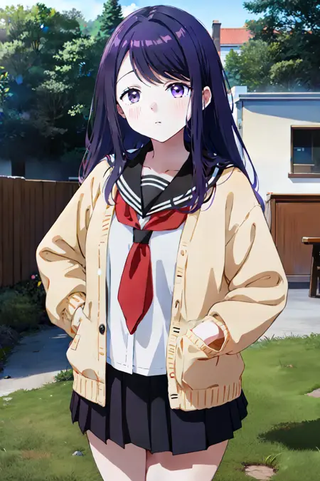 📌プロンプト:久古ナギサ、豊富な紫の髪、紫の目、黒のセーラーカラー、制服、セーラー服、白いシャツ、赤いネクタイ、黒のプリーツスカート、(茶色のカーディガン:1.1)、カーディガンを開いた状態、ロングスリーブ