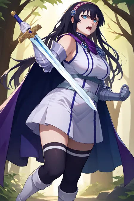 그녀의 전형적인 외모를 위해 "헤어밴드, 흰 드레스, 소매 없음, 보라색 망토, 장갑, 흰 장갑, 벨트, 검은 허벅지 양말, 흰 부츠"를 추가하세요.