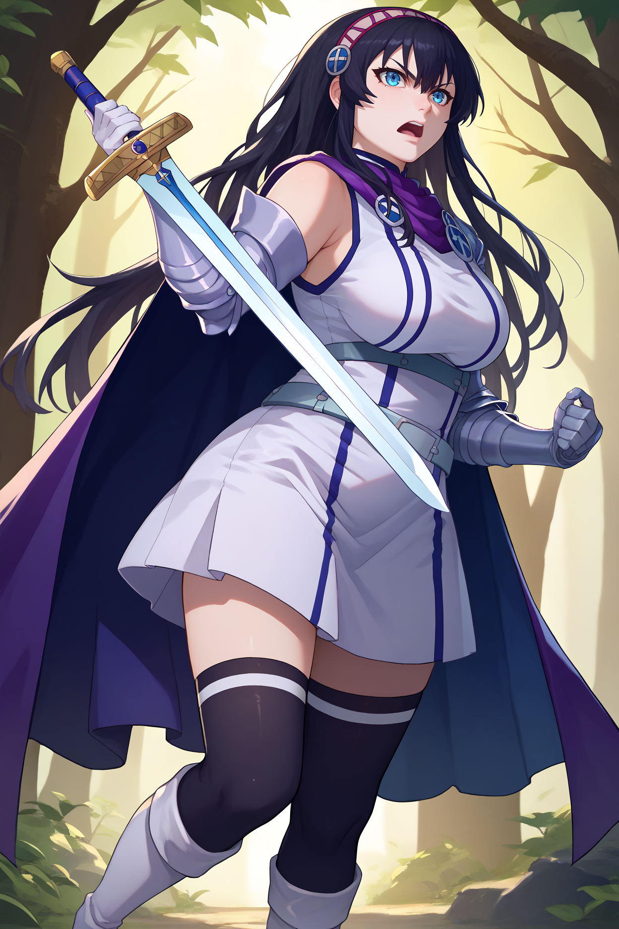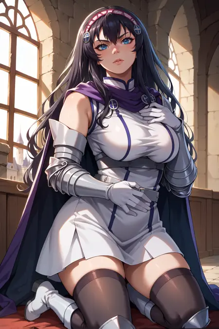 彼女の典型的な外見には、「ヘアバンド、白いドレス、ノースリーブ、紫のマント、手甲、白い手袋、ベルト、黒い thighhighs、白いブーツ」を追加してください。