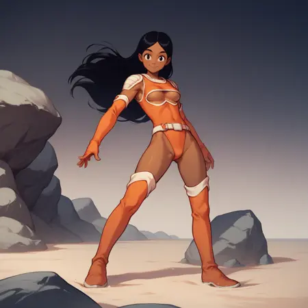 衣装:ボディスーツ、白いトリム、ベルト、ブーツ