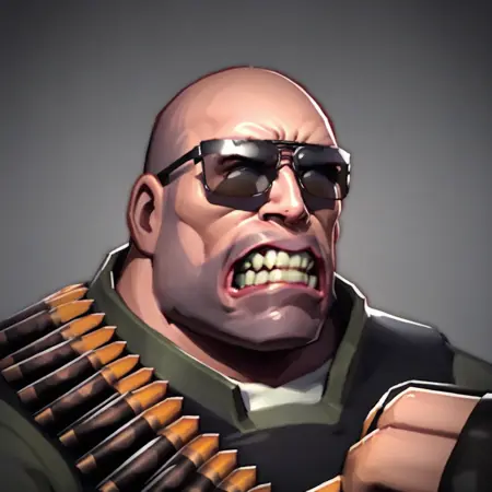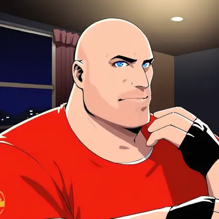 bald, blue eyes, gloves, fingerless gloves, bandolier, ammunition belt, weapon, machine gun, shirt, boots
