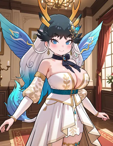[Appearance] kirin \(kemono friends\), horns, antlers, multicolored hair, gradient hair, black hair, white hair, blue hair, long hair, sidelocks, wings, tail, blue eyes, large breasts,