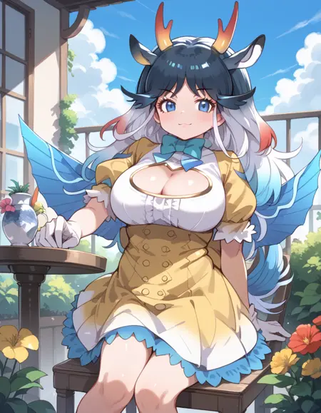 [Appearance] kirin \(kemono friends\), horns, antlers, multicolored hair, gradient hair, black hair, white hair, blue hair, long hair, sidelocks, wings, tail, blue eyes, large breasts,