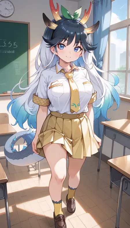 [外观] 麒麟 \(兽娘动物园\),角,鹿角,彩发,渐变发色,黑发,白发,蓝发,长发,鬓发,翅膀,尾巴,蓝眼睛,大乳房,