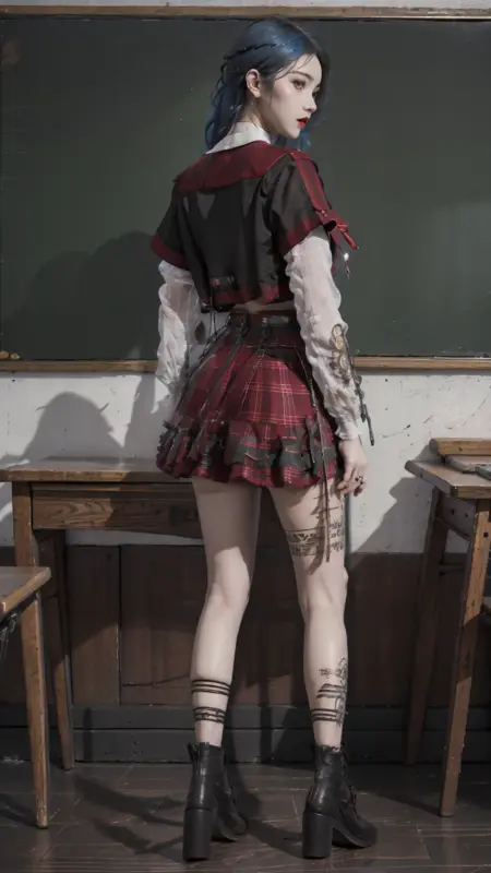 カーマインの羽模様の衣装、チェーン、胸のリボン、太ももチョーカー、ブラックトップ、レッドスカート、ステッカー