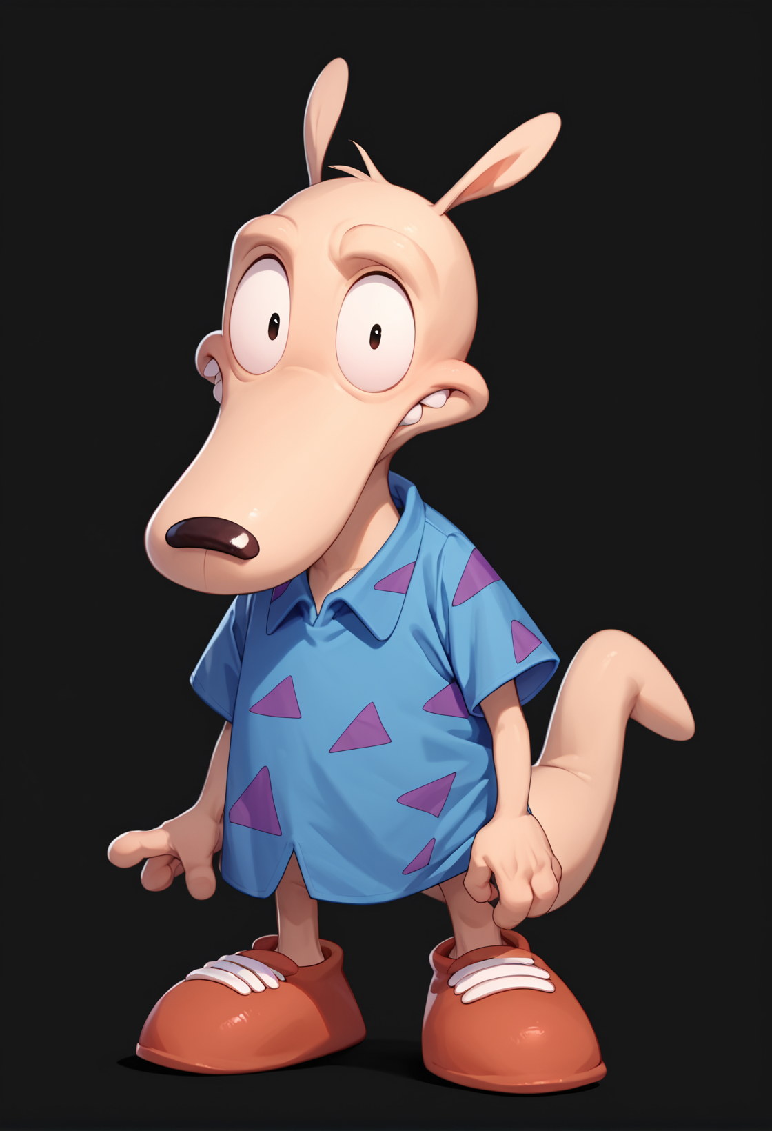 『ロコのモダンライフ』のワラビー、ロコ。元のアニメの画像を再描画したもの、映画のスクリーンショット、ファンアート、NSFWアート、さらには『オールスターブラル』からの画像を用いて学習させました。一貫性を保つため、手動で編集・クリーニングを行い、一部のソース画像は自分で描き直しました。
