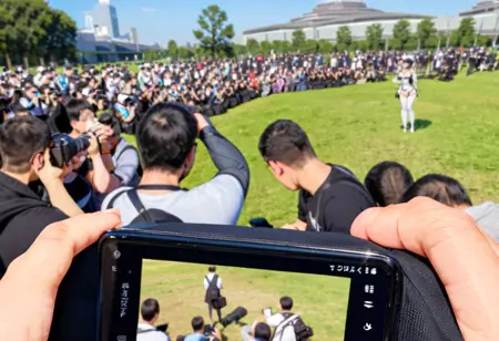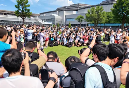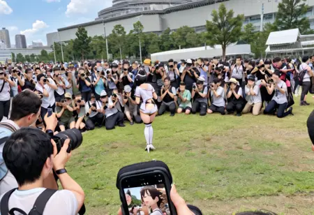 comiket_cosplay_Hiroba,, camera, 6+boys, outdoors, sportswear, baseball cap, holding camera, multiple boys, backpack, sky, bag, day, crowd, taking picture, hat, blue sky, holding, skirt, baseball uniform, shirt, white shirt, photo background, stadium, backwards hat, multiple girls, standing, scenery, watch