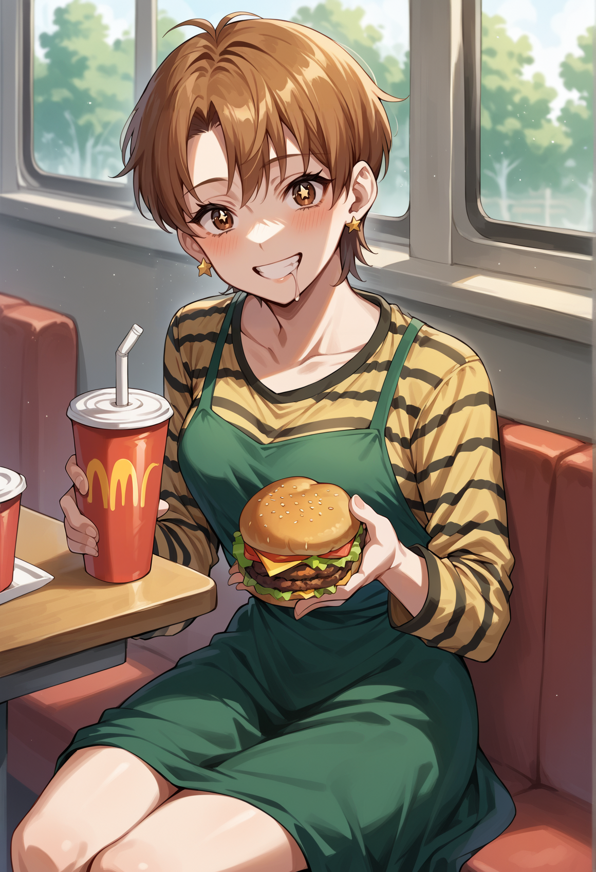 クラシックタイガ:ショートヘア、茶色の髪、茶色の目、イヤリング、縞模様のシャツ、緑のドレス
